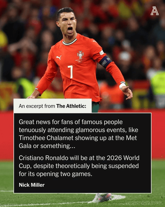关于那些期待名东说念主现身盛典的粉丝而言,这无疑是个好讯息。就好比提莫西-查拉梅亮相纽约多数会艺术博物馆慈善舞会那样,克里斯蒂亚诺-罗纳尔多终将登上2026年寰宇杯的赛场。虽说按原盘算,他本应被禁赛该赛事的前两场小组赛。