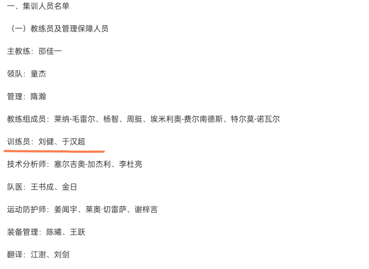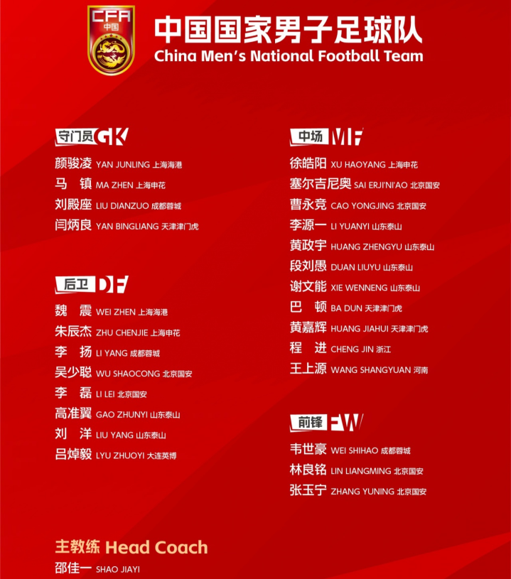 2026年1月1日,国足公布了2026年首期集训名单,计较有26名球员干预,杨智、周挺、毛雷尔等东谈主加入了国足解说组,主解说则是原土名帅邵佳一。这一次国足的球员名单、解说构成员均发生了不小的变化:李扬、闫炳良、吕焯毅3名球员初度入选国度队,解说组则基本是之前青岛西海岸的班底,归化球员只好塞尔吉尼奥1东谈主入选,门将则有刘殿座、颜骏凌、马镇、闫炳良4东谈主入选。(集训具体名单如下图)
