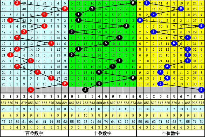 百位号码:第26056期-26060期奖号为:4-2-5-7-9,振幅为7点,散播较分离,本期看好百位走低,瞩目号码4。